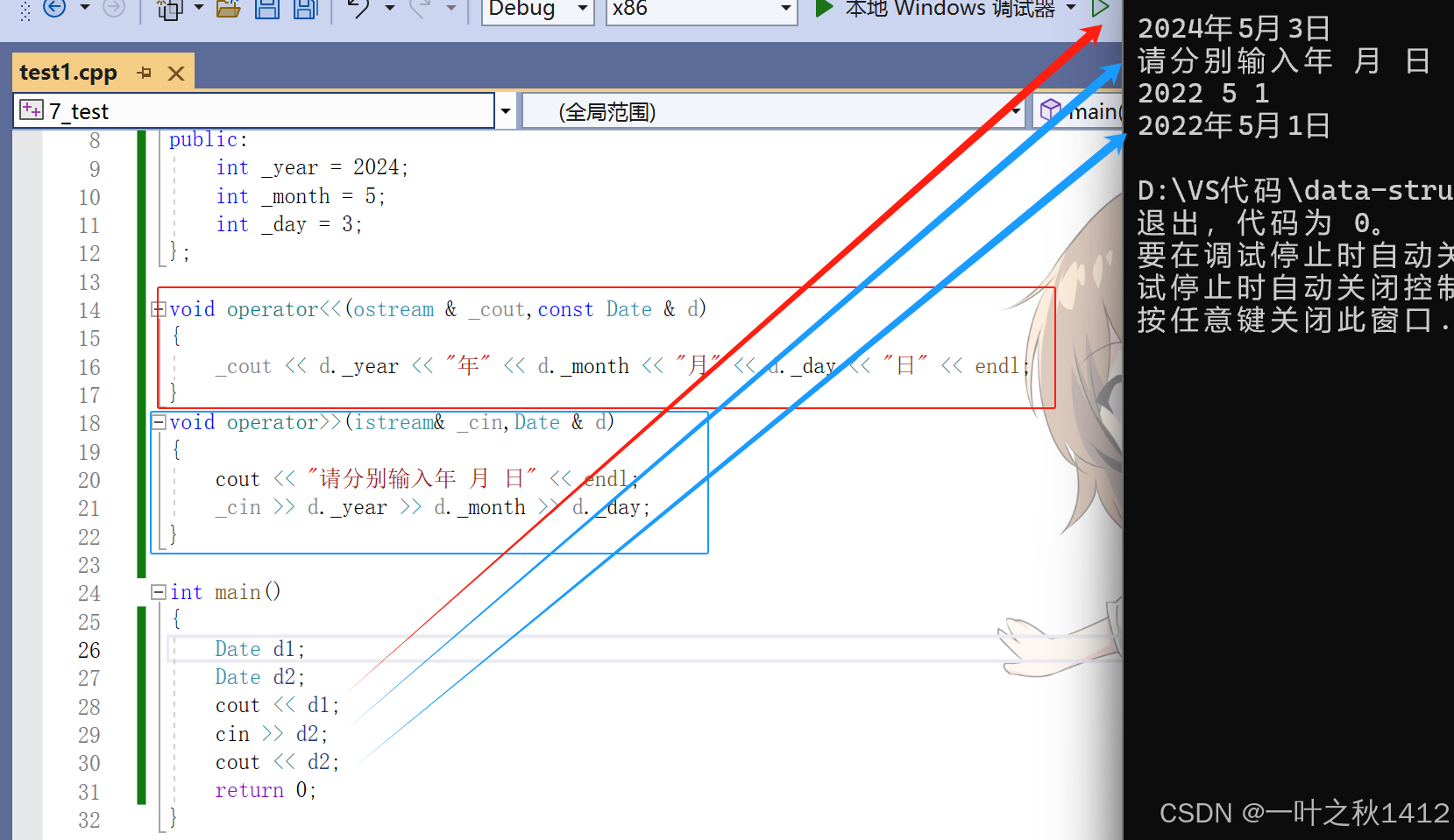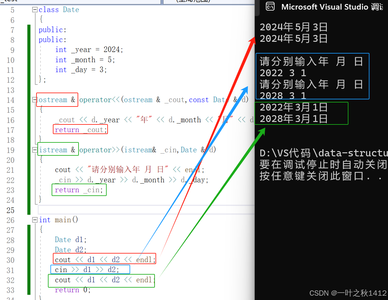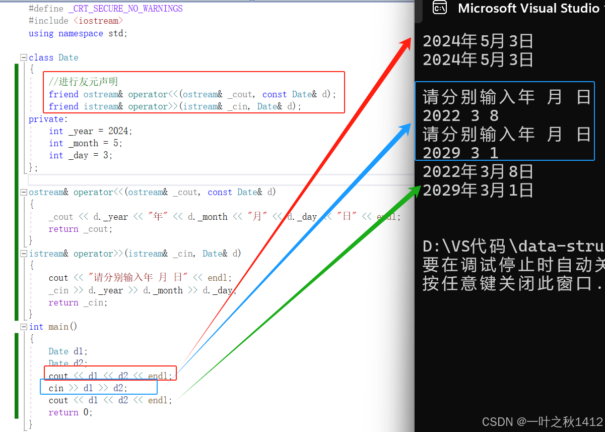 通过观察我们可以清晰地发现,<<与>>无法重载成类的成员函数,只能重载成全局函数,但是重载成全局函数的话,就没办法访问类的私有成员变量了,因此这个时候就需要使用友元来帮助.