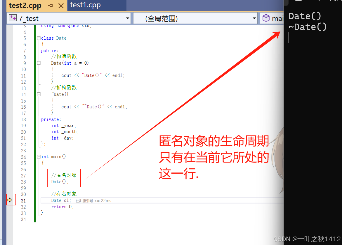 在之前我们所使用的对象都是有名对象,这种对象有属于自己的名字,但除了有名对象外,还有一种对象,叫做匿名对象.匿名对象有一个特性,那就是它的生命周期只有这一行,在下一行它会自动调用析构函数.