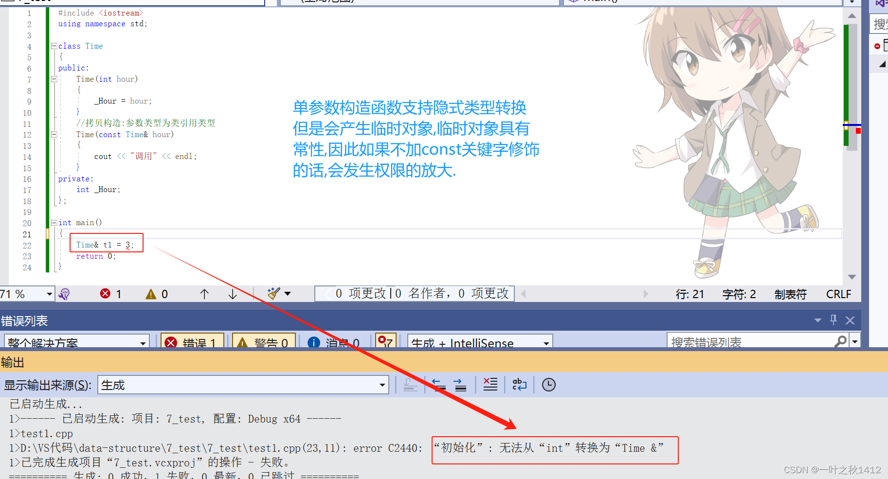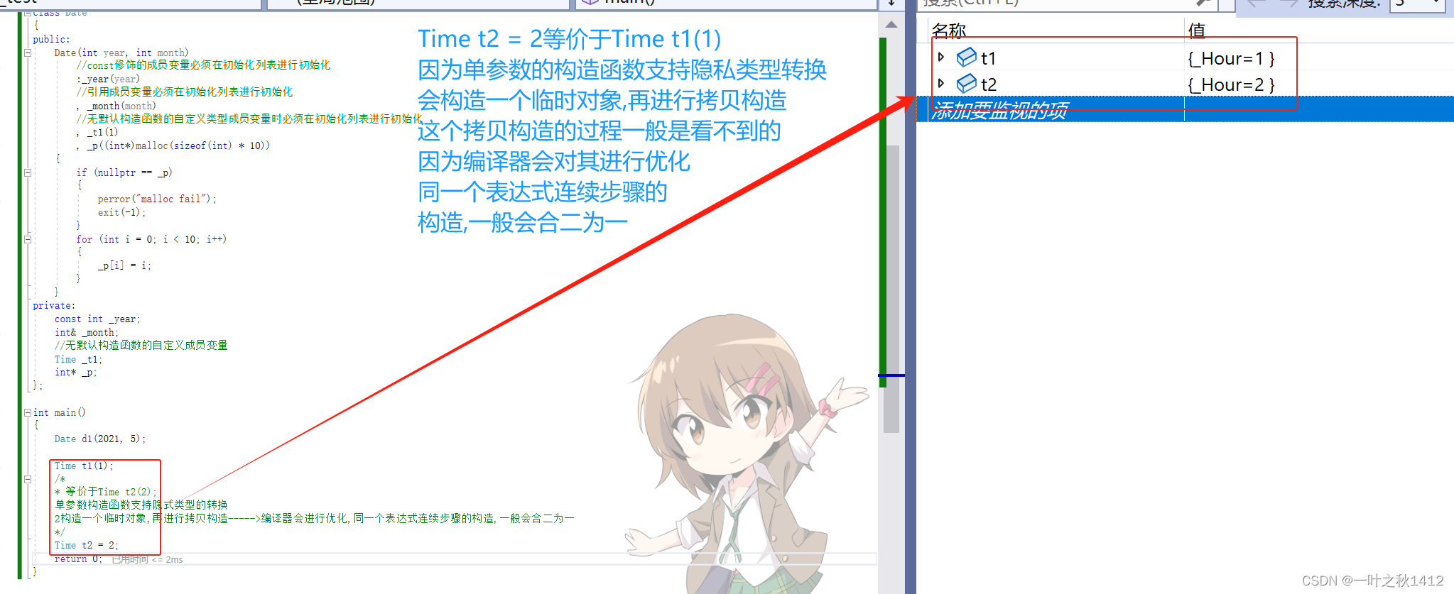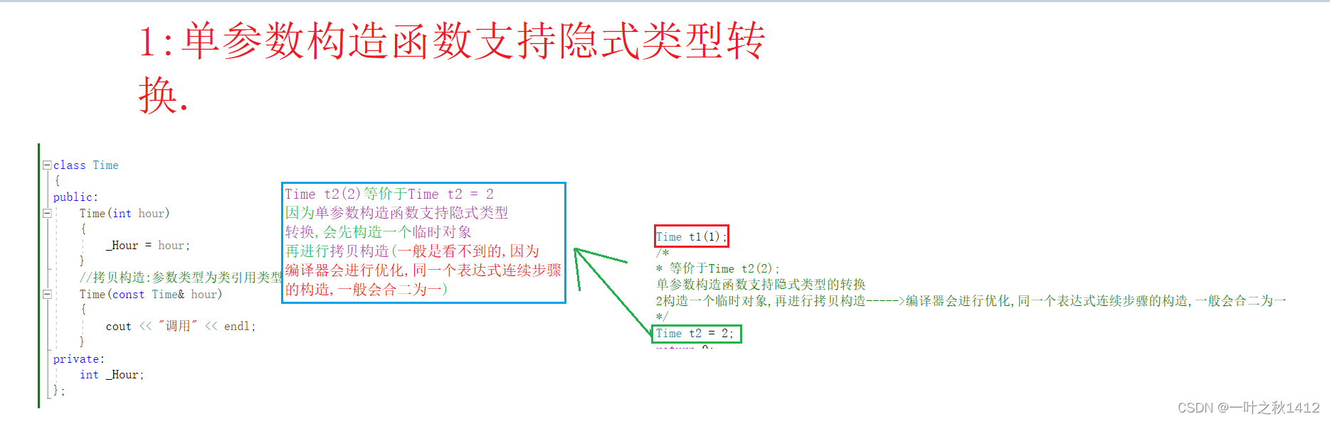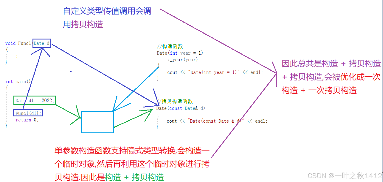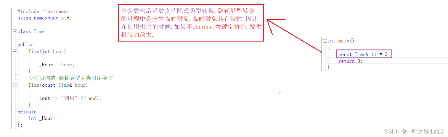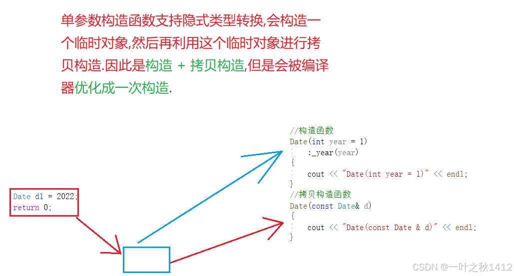 //单参数构造函数支持隐式类型的转换,构造一个临时对象, 再进行拷贝构造