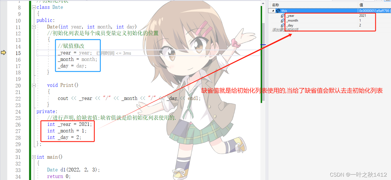 //进行声明,给缺省值:缺省值就是给初始化列表使用的.