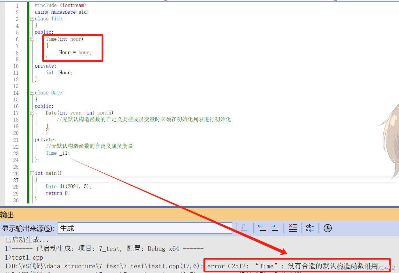 cout << "Time(int hour)---->无默认构造函数" << endl;