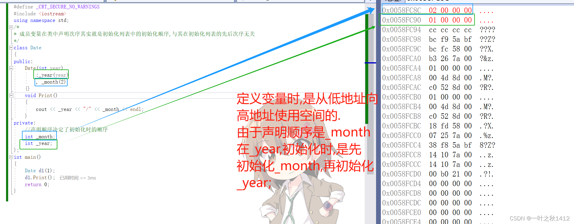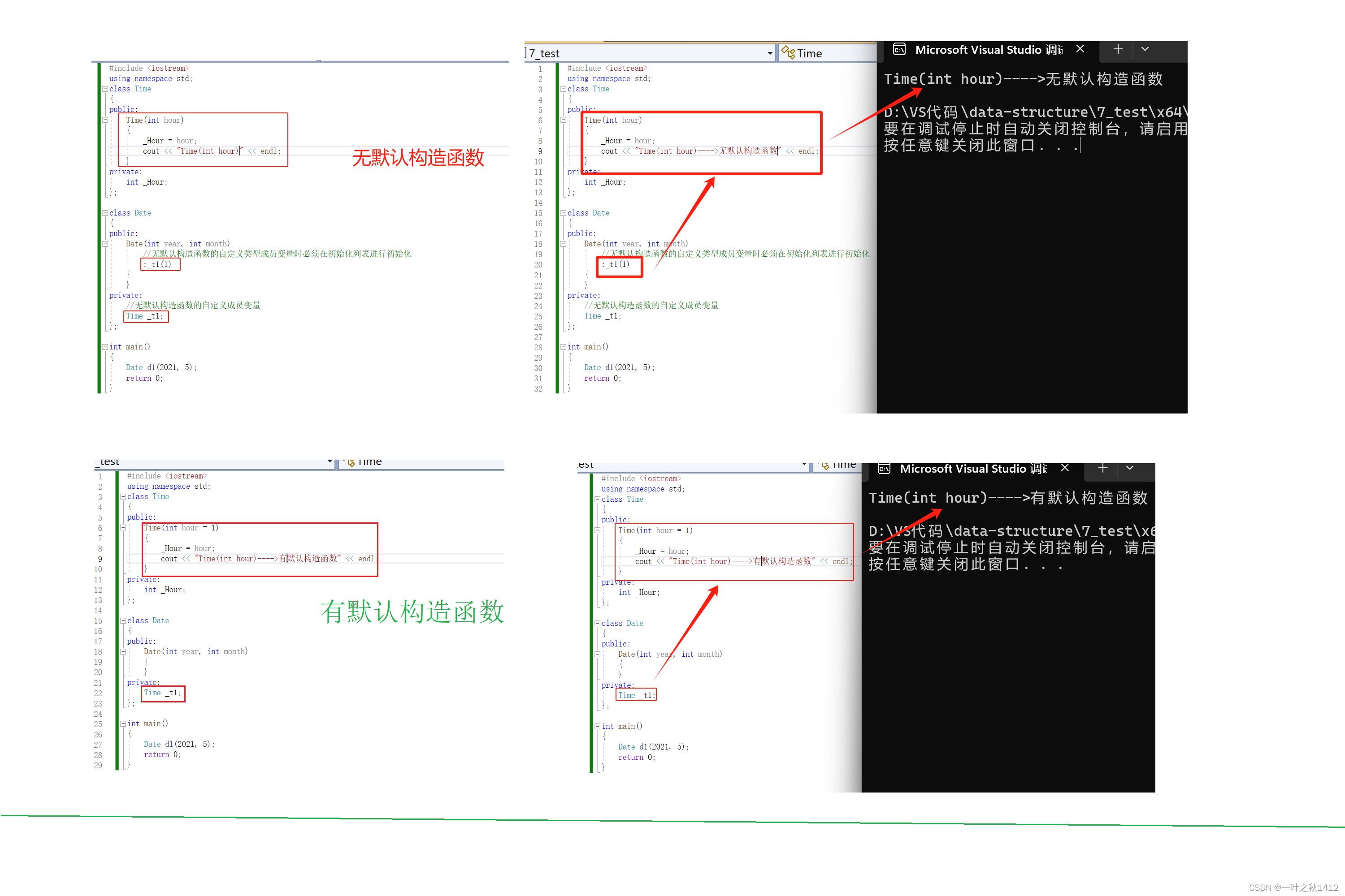 为什么说对于无默认构造函数的自定义类型成员变量时必须在初始化列表进行初始化呢? 因为初始化列表是每个成员变量定义并且初始化的位置. 对于有默认的构造函数的自定义类型成员变量,在对象实例化的时候,会默认走初始化列表,然后通过初始化列表调用其对应的默认构造函数. 我们来简单对比下