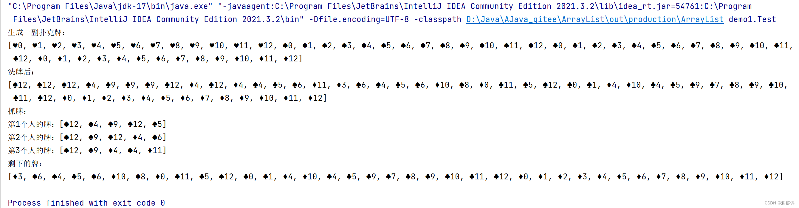 }每个人抓的牌放到哪里?创建一个顺序表,每次抓到的牌add到对应人的手中 三个人怎么轮流抓取五张牌?通过双层for循环来实现,第一轮每人抓一张牌,进行五轮 怎么抓牌?通过remove来删除0下标的牌 抓的牌放到谁的手中?抓牌后添加到对应的人的手中,i就表示第几个人