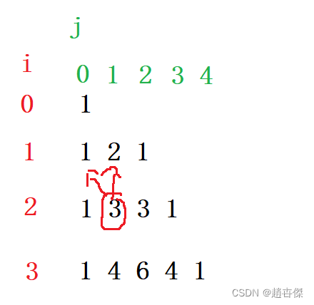 List<List<Integer>>表示创建了一个顺序表,顺序表中的每一个元素都是存储整形的顺序表当i==j时的位置上都是1,直接添加到顺序表即可,其他位置上的值:例如[2][1]的3==[1][2]的2+[1][1]1,这样就生成了一组数据,每生成一组就追加到顺序表中