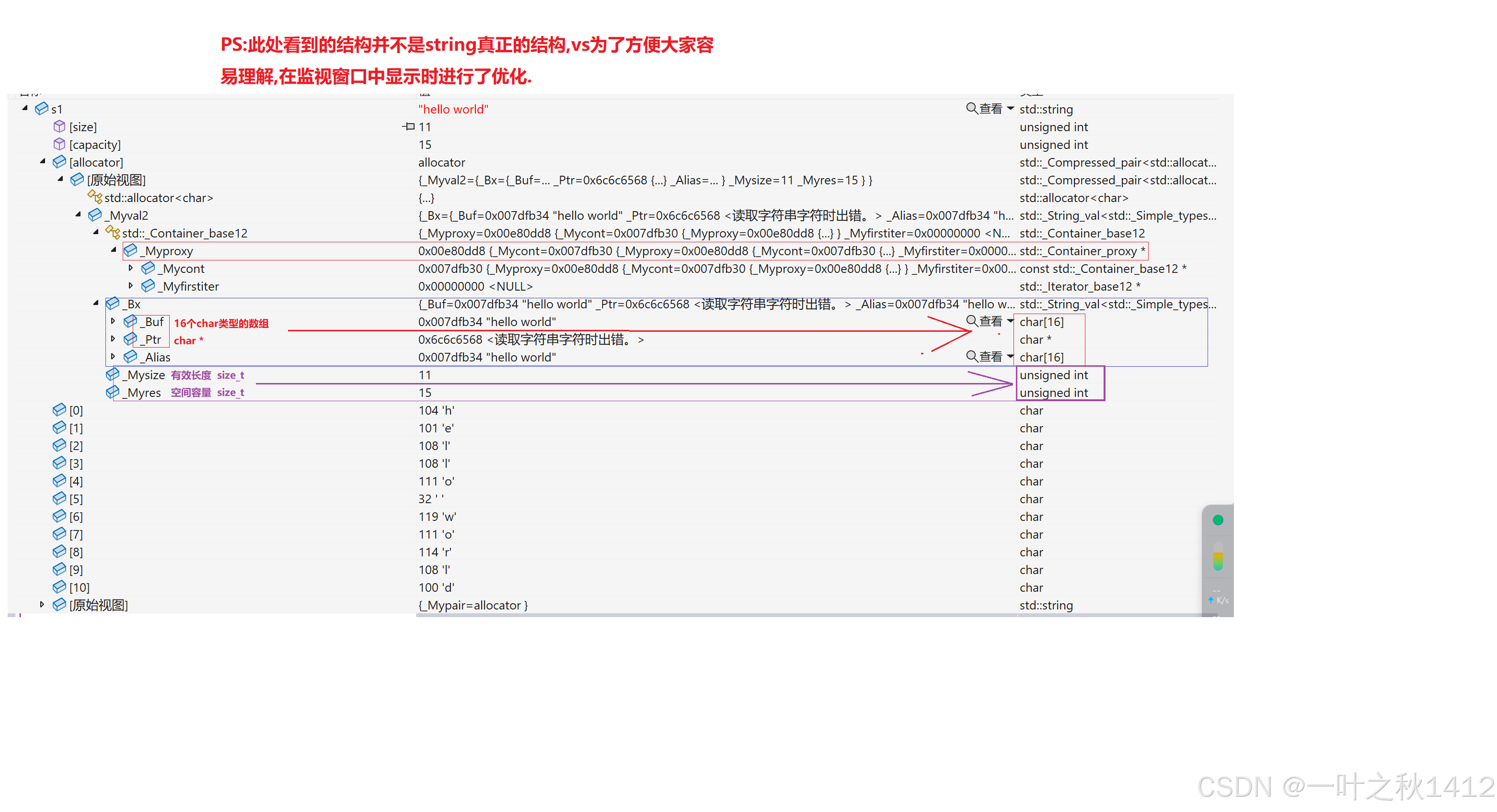 string总共占28个字节,内部结构稍微复杂些,先是有一个联合体,联合体用来定义string中字符串的存储空间: