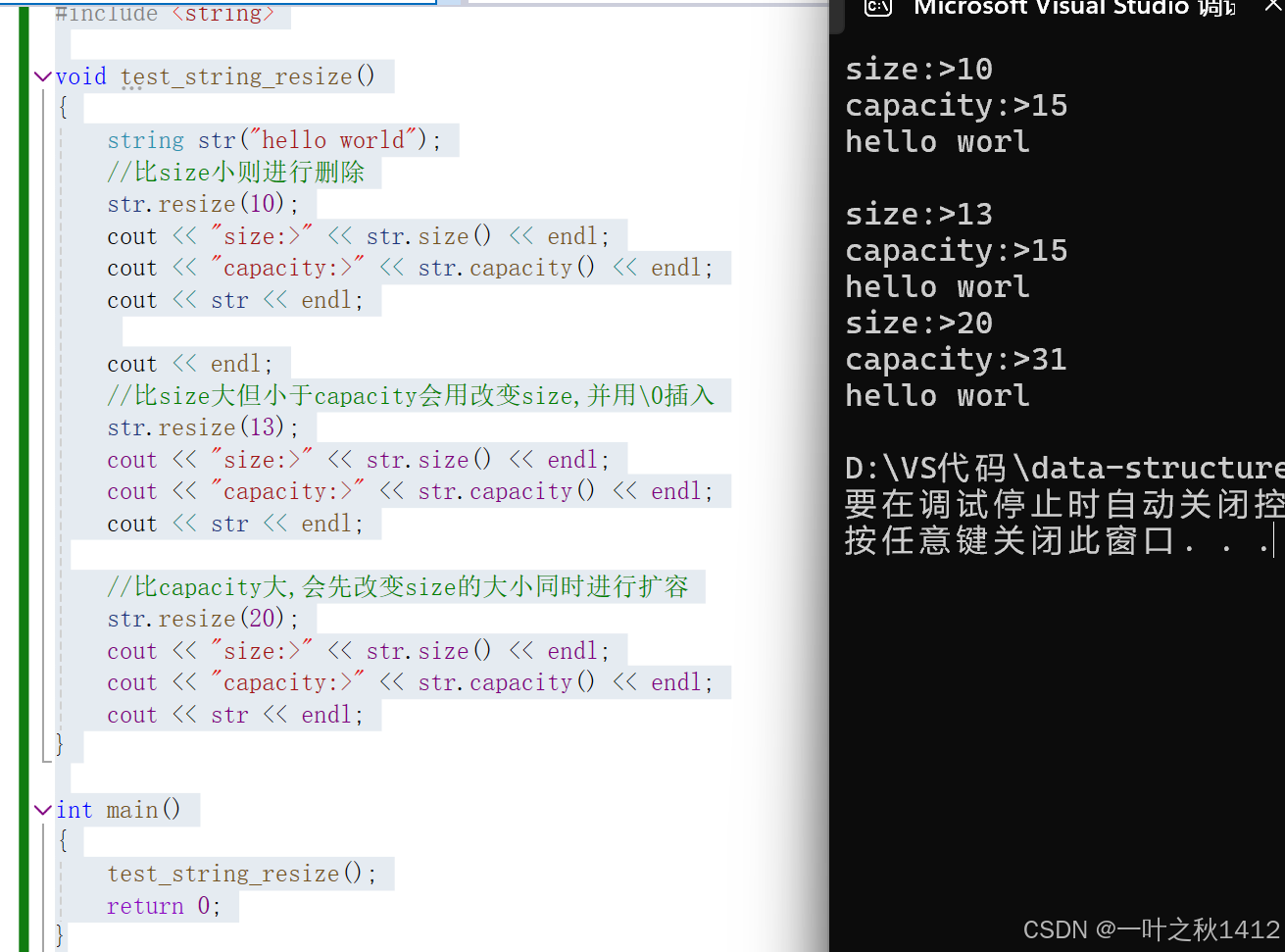 //比size大但小于capacity会用改变size,并用\0插入