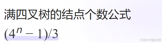 题目: 一颗拥有1000个结点的树,树的度(即一个节点的最大子节点数)为4,则它的最小深度是( ) 当这棵树每一层都是满的时,它的深度最小。也就是说,这棵树应当是一棵满四叉树。 高度为h,则这个树的节点个数为(4^h - 1) / 3,当h = 5, 最大节点数为341, 当h = 6, 最大节点数为1365,所以最小深度应该为6。