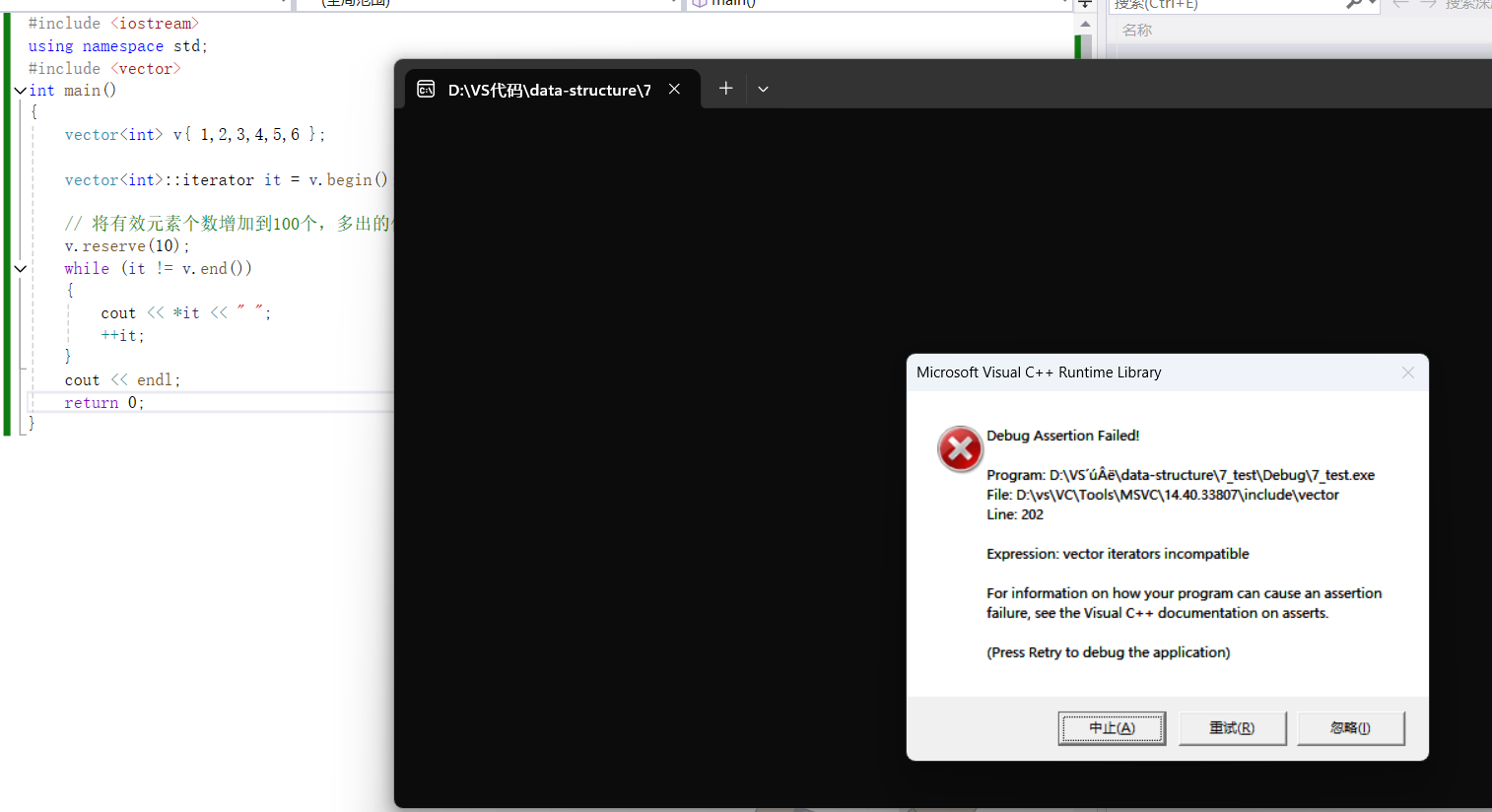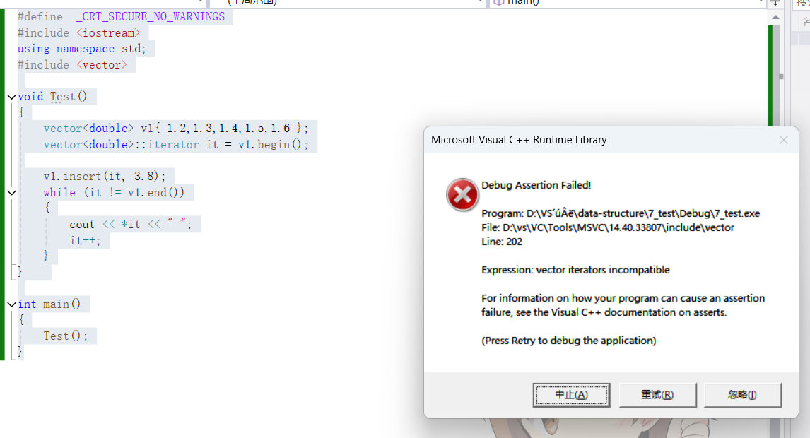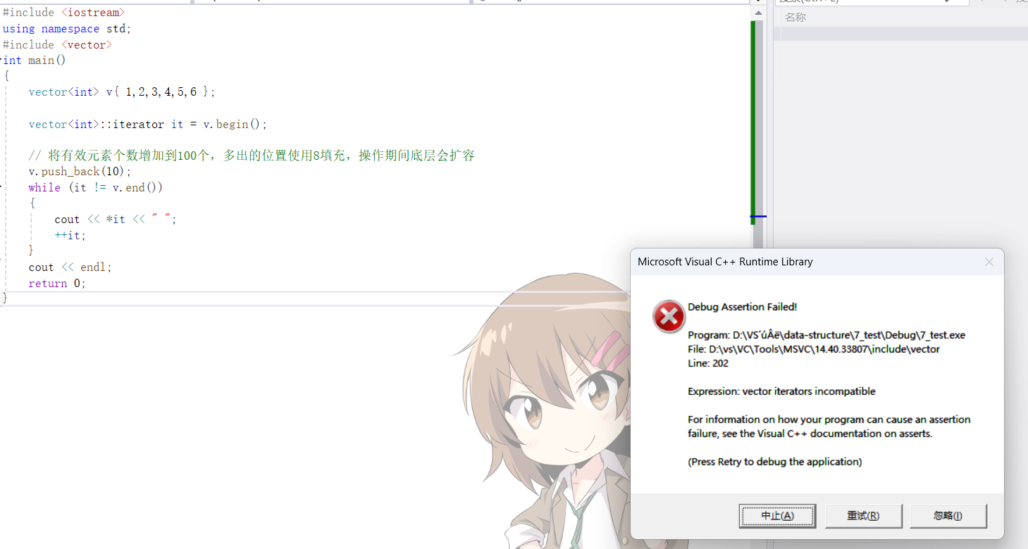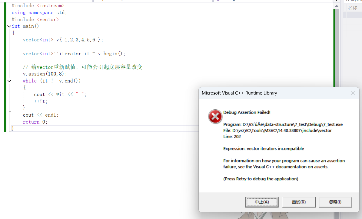 上面的五段代码都出现了报错,原因是,上述的操作,都有可能导致vector扩容,也就是说vector底层原理旧空间被释放掉,而在打印时,it还使用的是释放之前的旧空间,在对it迭代器操作时,实际操作的是一块已经被释放的空间,而引起代码运行时崩溃. 解决方式:在以上操作完成之后,如果想要继续通过迭代器操作vector中的元素,只需给it重新赋值即可。