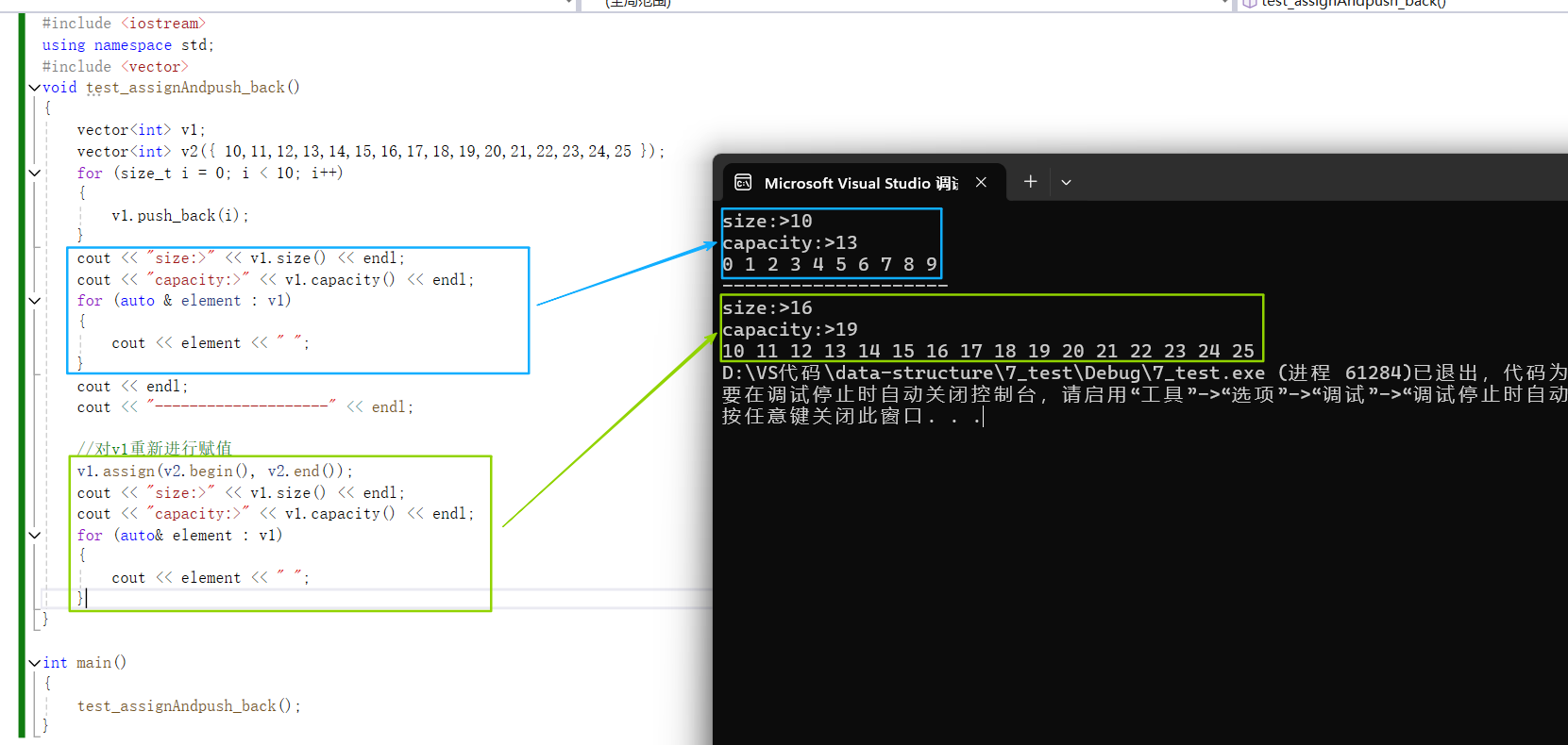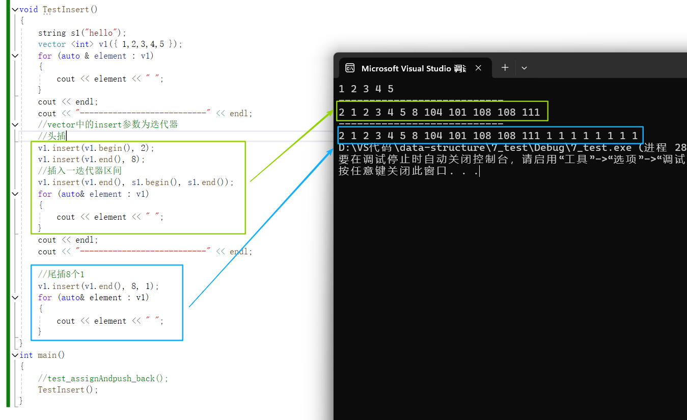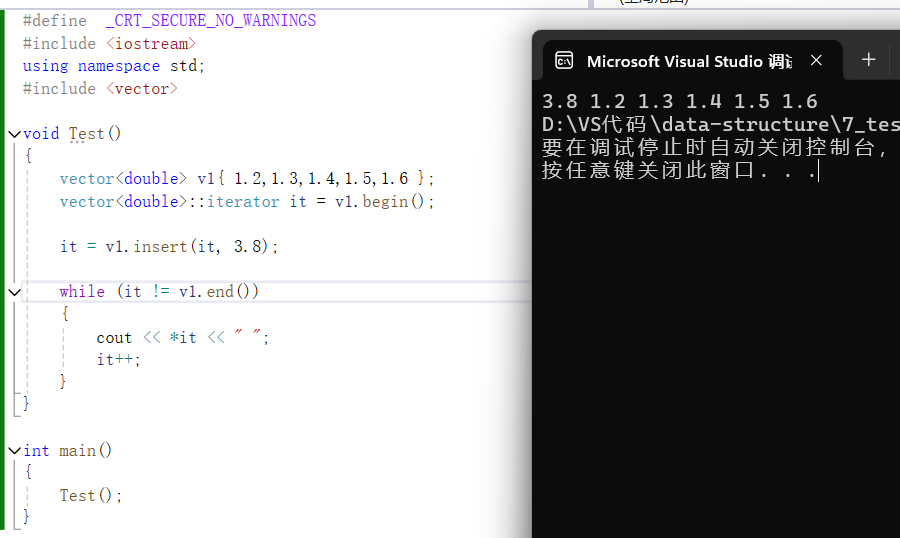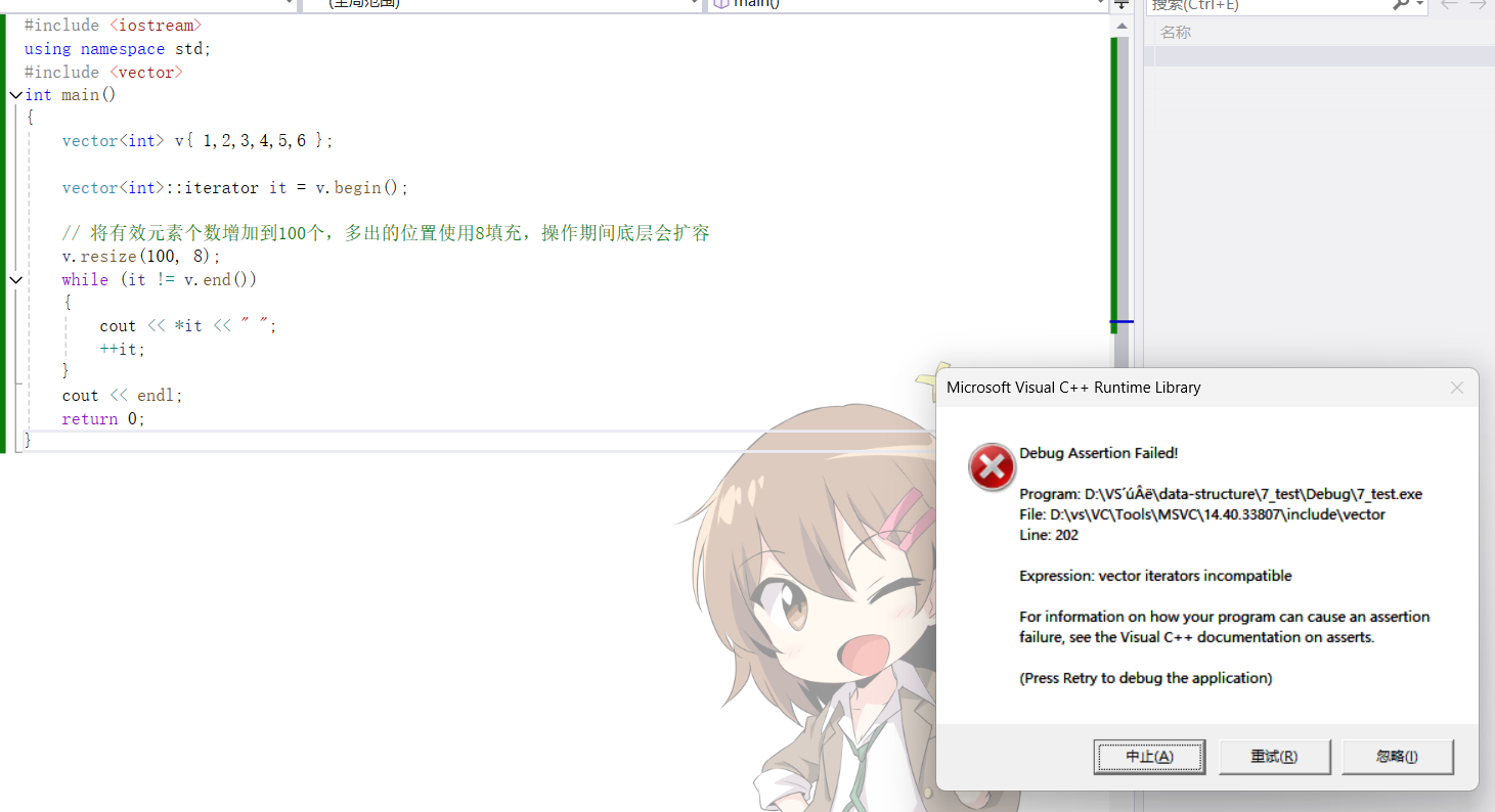 上面的五段代码都出现了报错,原因是,上述的操作,都有可能导致vector扩容,也就是说vector底层原理旧空间被释放掉,而在打印时,it还使用的是释放之前的旧空间,在对it迭代器操作时,实际操作的是一块已经被释放的空间,而引起代码运行时崩溃. 解决方式:在以上操作完成之后,如果想要继续通过迭代器操作vector中的元素,只需给it重新赋值即可。