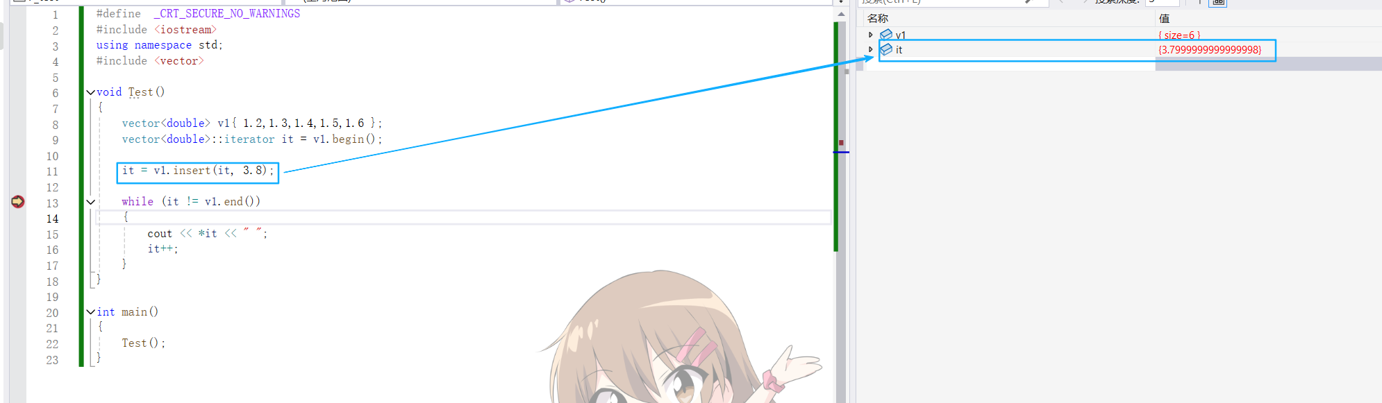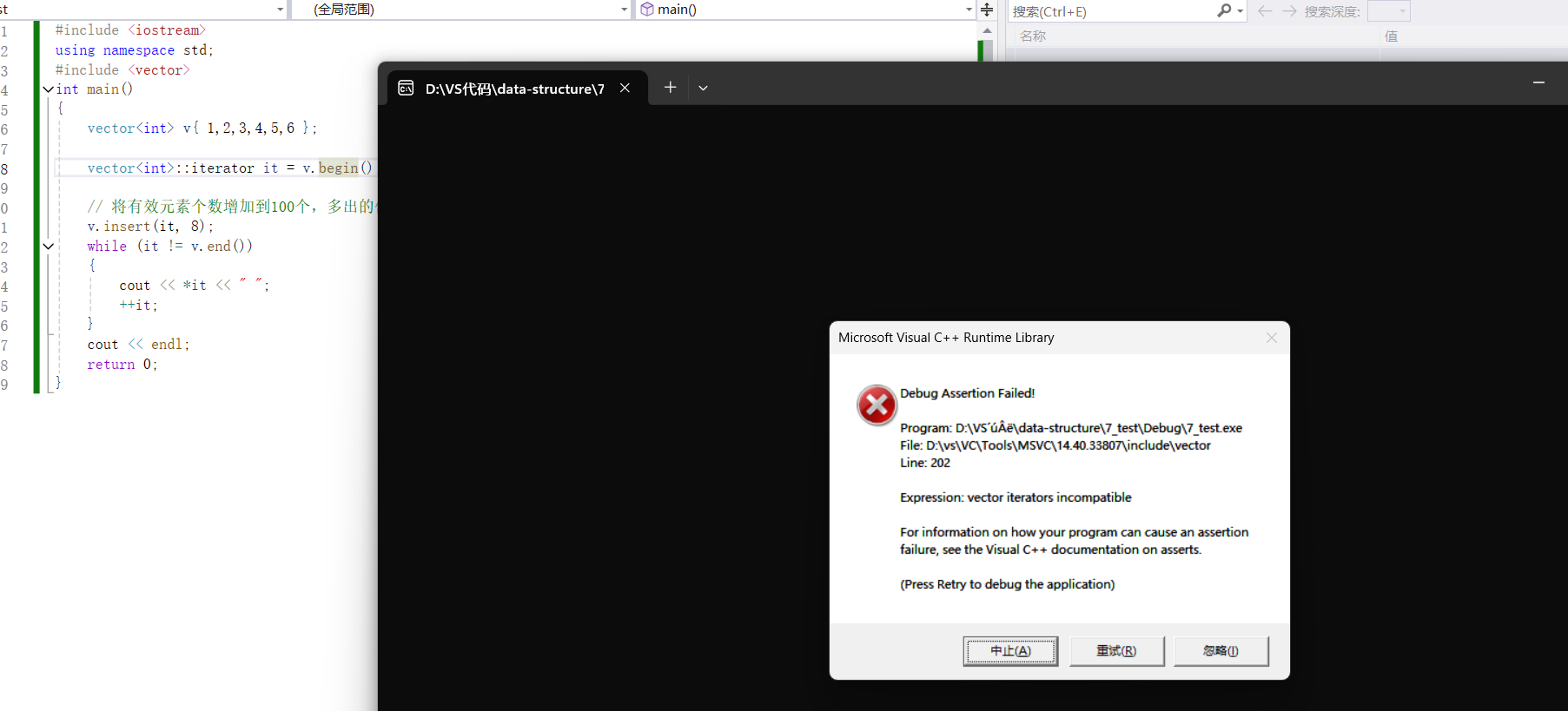 通过调试我们可以清晰地发现,在insert以后,it就变成了随机值,这是因为insert了以后,it就失效了,就不可以再进行使用了,那么此时要么不再使用,要么就更新迭代器.