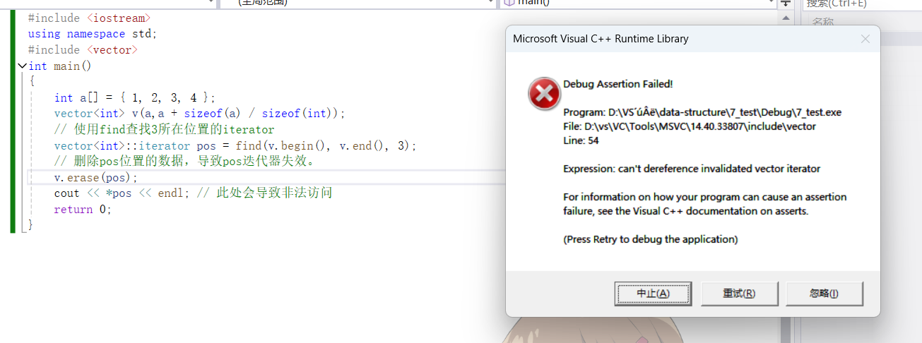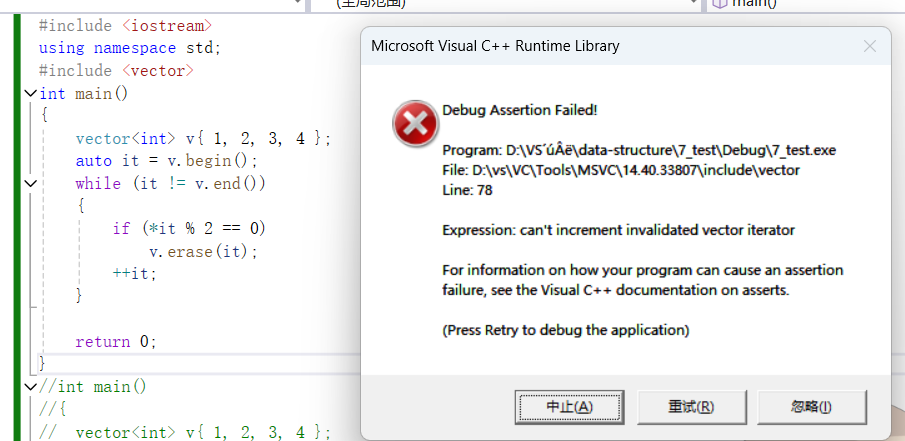 迭代器的主要作用就是 让算法能够不用关心底层数据结构,其底层实际就是一个指针 ,或者是 对指针进行了 封装 ,比如: vector的迭代器就是原生态指针T* 。因此 迭代器失效,实际就是 迭代器底层对应指针所指向的 空间被销毁了,而使用一块已经被释放的空间 ,造成的后果是程序崩溃 ( 即 如果继续使用已经失效的迭代器, 程序可能会崩溃).