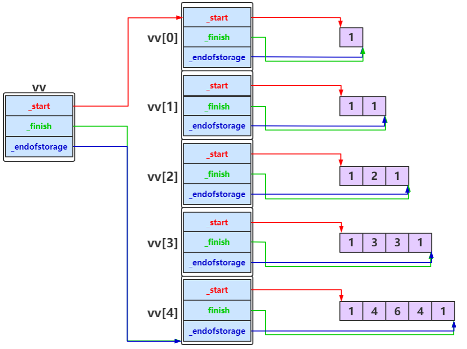 vector<vector<int>> vv(n); 构造一个vv动态二维数组,vv中总共有n个元素,每个元素都是vector类型的,每行没有包含任何元素,如果n为5时如下图所示.