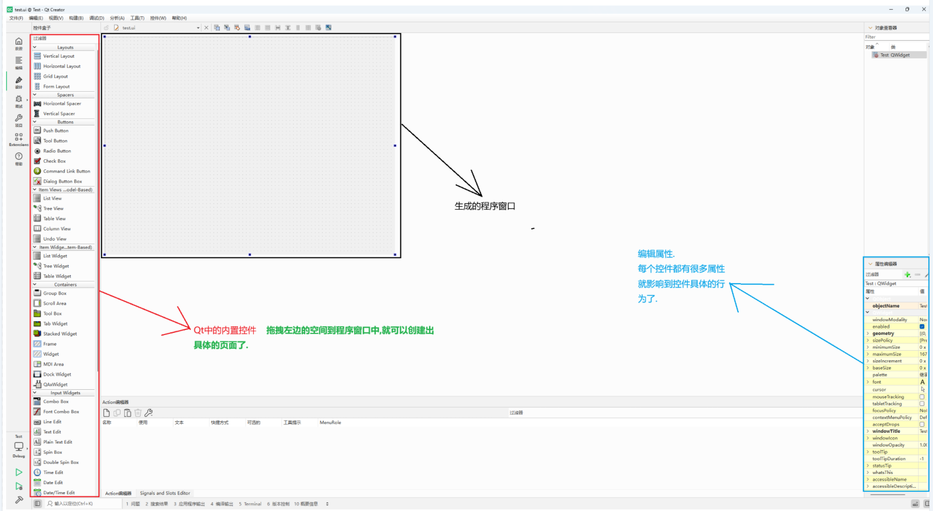 双击Test.ui文件后,此时Qt Creator就会调用Qt Designer,打开ui文件.