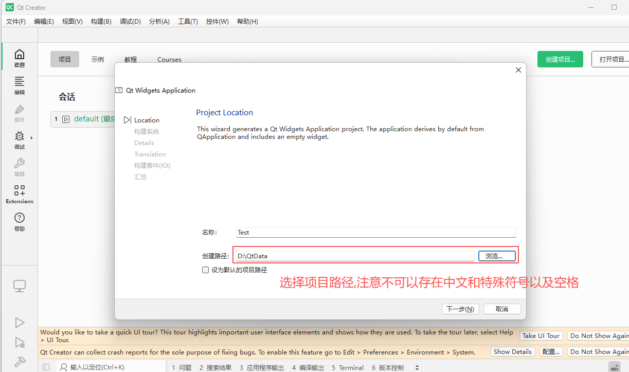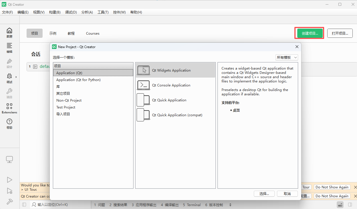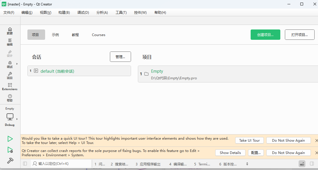 1:双击打开 Qt Creator ⼯具,并进⼊到 "欢迎模式" 下的 "示例" 界⾯;