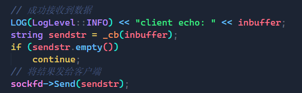 而我们将回调的函数返回值设置为string,参数也设置为string,返回值返回的就是我们未来要发给客户端的结果,而传进去的参数就是通过Recv读取到的字符串。