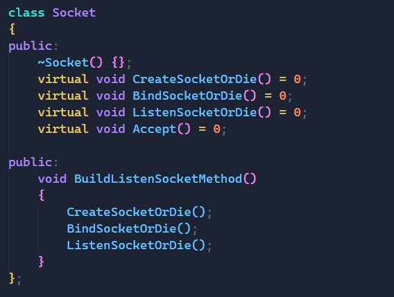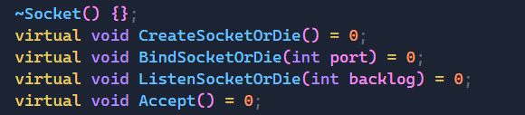 那么首先我们先定义一个Socket类,把它作为基类,里面有一些纯虚函数,未来是需要子类来实现的,包括:create,bind,listen这些我们熟知的创建套接字的流程函数,子类都要将其实现。