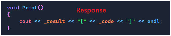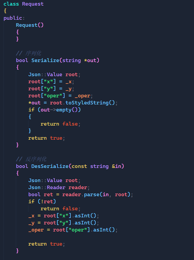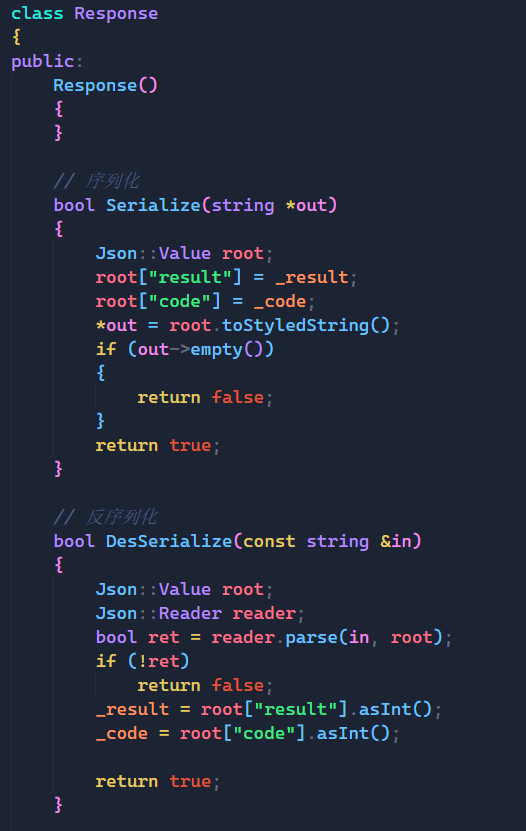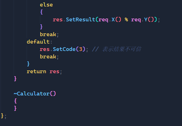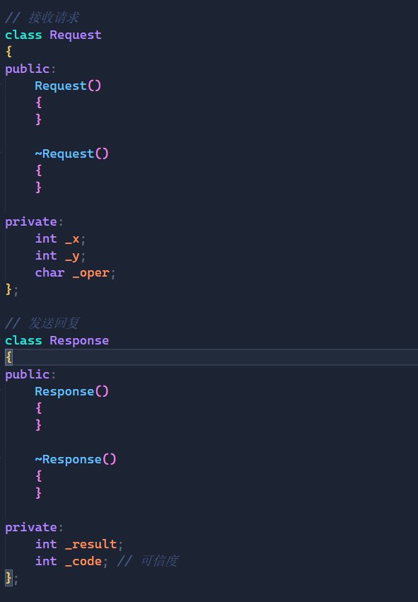而Response类中我们要返回计算后的结果,而在该类中我又定义了一个_code的成员变量,这个变量用来表示可信度,就比如:如果客户端传来的是10 / 0,那么我们就无法给result一个准确的值,所以如果是这种情况,我们就需要_code变量来表明此时的result是不可信的,是错误的。