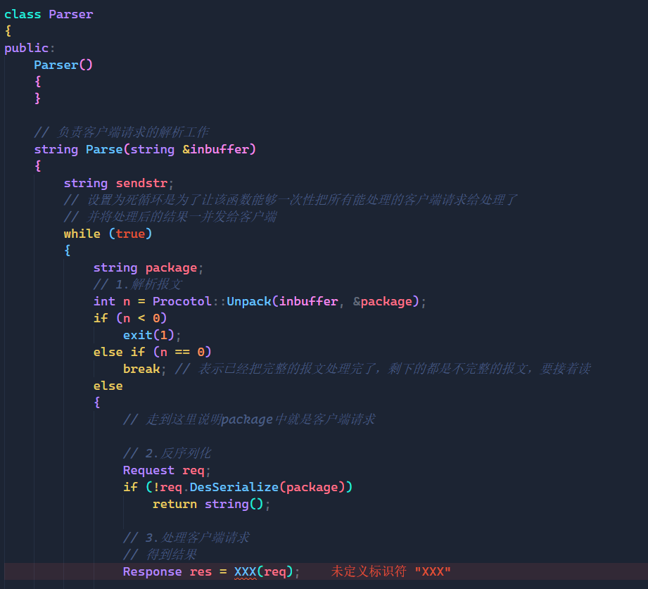 这里我的做法是单独再创建一个Parser类来处理客户端的请求,里面的Parse函数就是用来完成该工作的。
