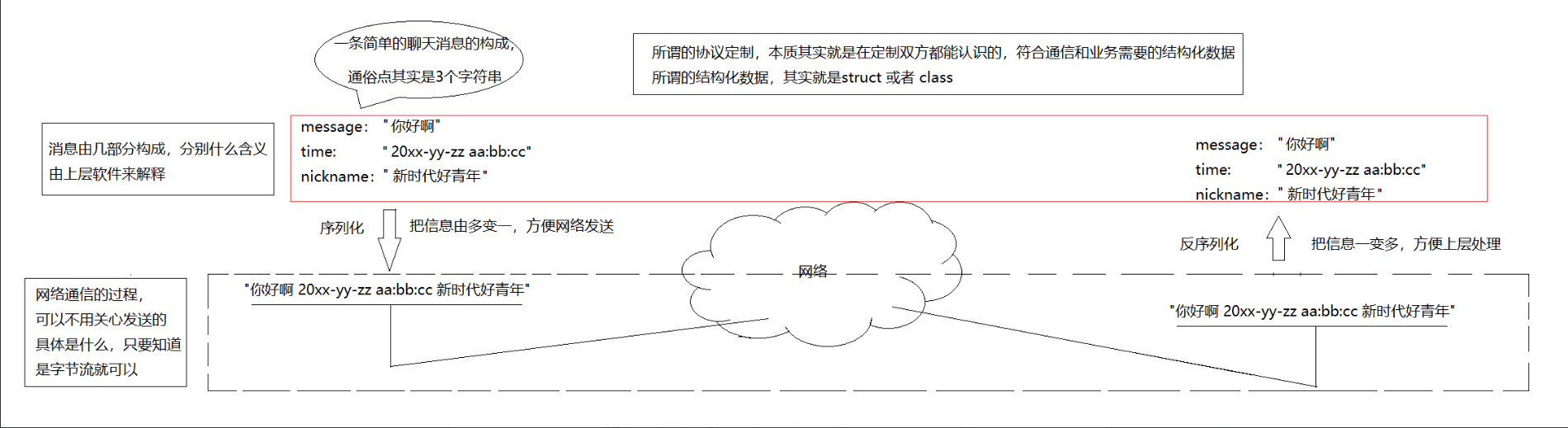 而接收方在收到字符串后,会按照相同的转换原则,将字符串中的信息一一提取出来,交给上层处理。