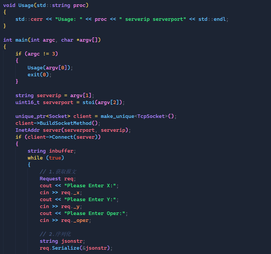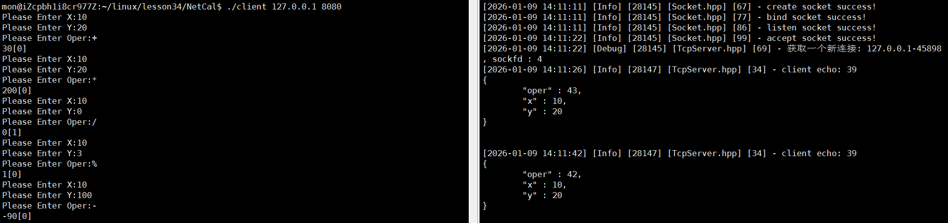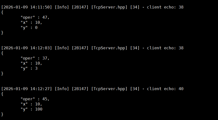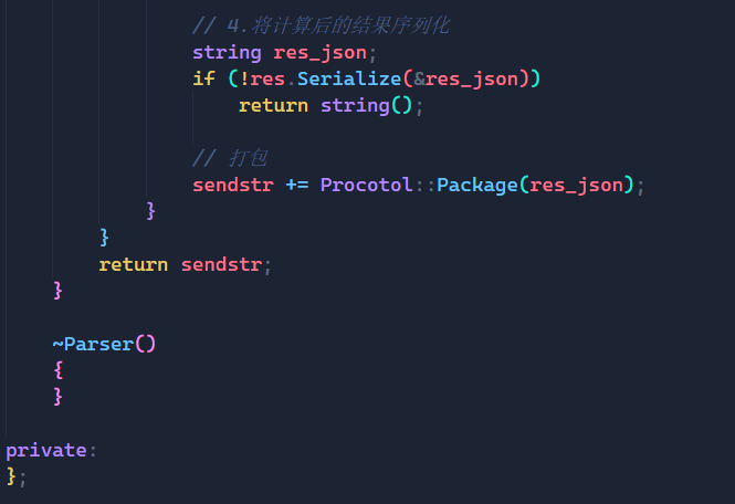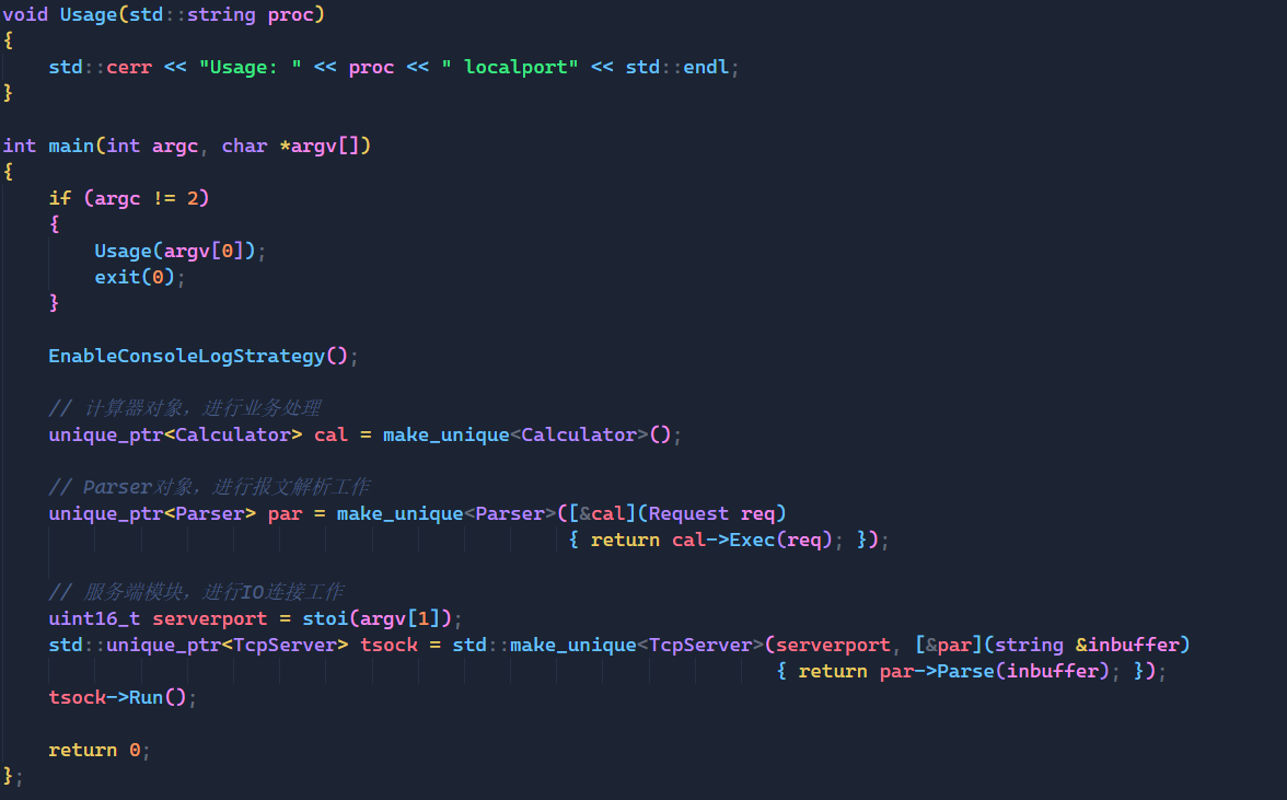 上面就是未来我们运行服务端的完整代码了,通过将服务器,Paser,Calculator这三个模块关联起来,我们就可以完成与客户端建立连接,解析客户端请求,处理客户端请求的全部工作了。