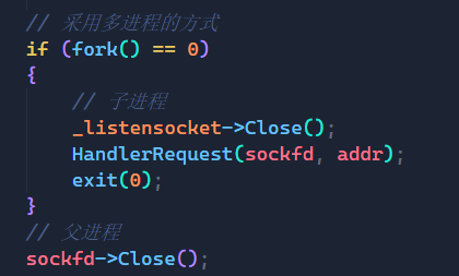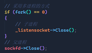 思路同样很简单,我们实现之后就可以用来关闭文件,对于子进程而言,它用不到listensocket,所以子进程要将其关闭,对于父进程而言,它用不到新创建的sockfd,所以父进程要将其关闭。