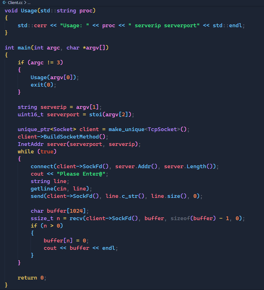 上面就是客户端的完整代码,客户端中需要用到的一些额外的函数我都已经放在了上面,这些函数没什么难度,就不多讲了。