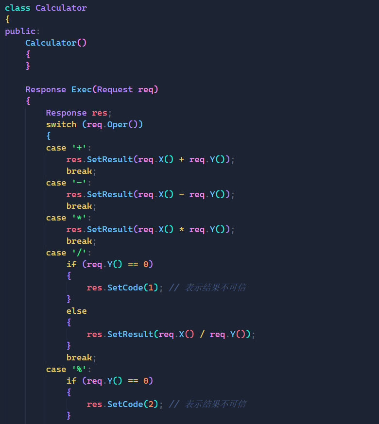 这里我的做法是创建一个Calculator类,在这个类中实现Exec函数来完成上面的工作,这里的逻辑也很简单,通过判断req对象中的运算符,通过switch语句就可以完成上面的工作,这里我只实现了常见的+,-,*,/,%五种运算。