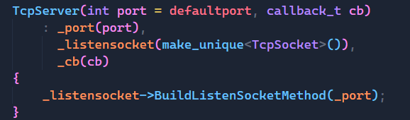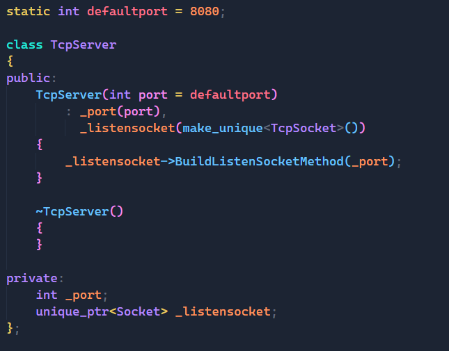 有了上面铺垫,那么对于TcpServer我们就可以直接写出上面的内容,端口号不用多说,我们未来是要传给build函数的,所以将其作为成员变量无可厚非,而我们设计出Socket类,就是要用它,所以我们也不单独设计Init函数了,直接在构造函数中通过build函数完成初始化的工作。