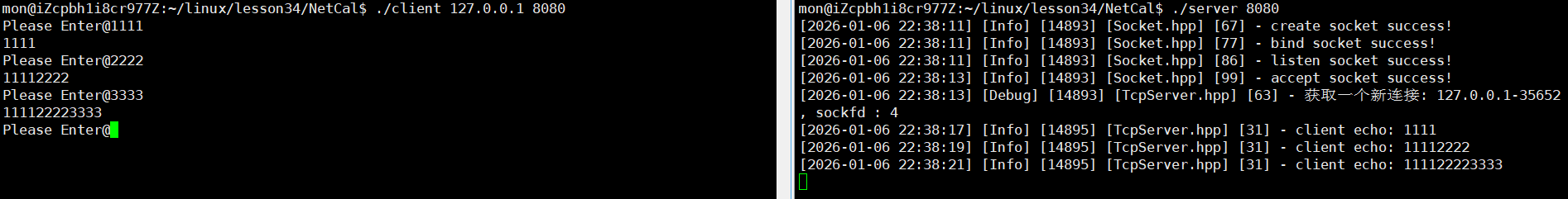 从结果中我们可以看到此时我们的代码是可以进行通信的,但是我们也看到了我们通信的内容,也就是服务端返回的字符串一直在变长,这一点我们也能理解: