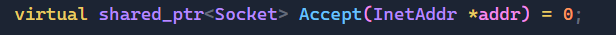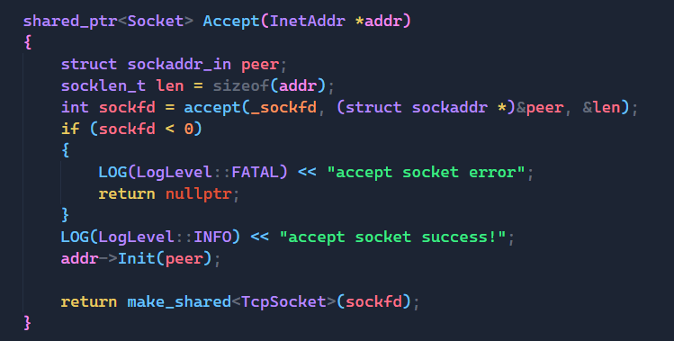 这就是目前要实现的Accept函数,对于Accept函数,我们不仅要它成功后返回的文件描述符,还要知道发送信息的客户端的相关属性,如:IP地址和端口号,这些信息都会保存在peer中,然后我们通过传进来的addr来调用Init函数,实现赋值操作,即可拿到客户端的相关信息。