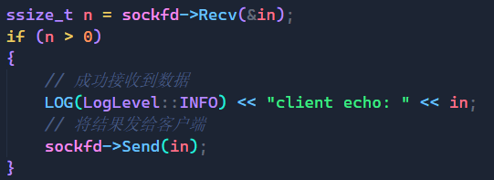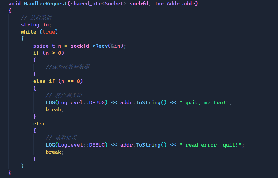 那么首先既然要处理客户端的请求我们就要先拿到客户端传进来的数据,所以这里我又设计了一个Recv函数用来接收客户端传来的数据,并对读取到的字节进行了简单的判断。