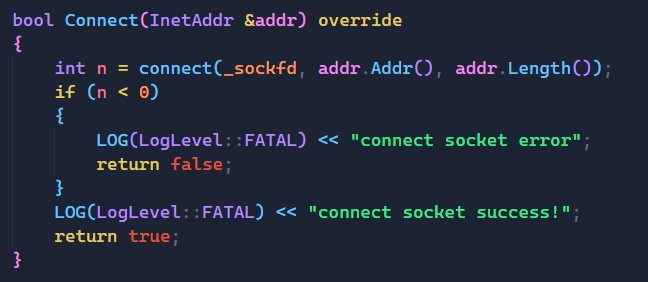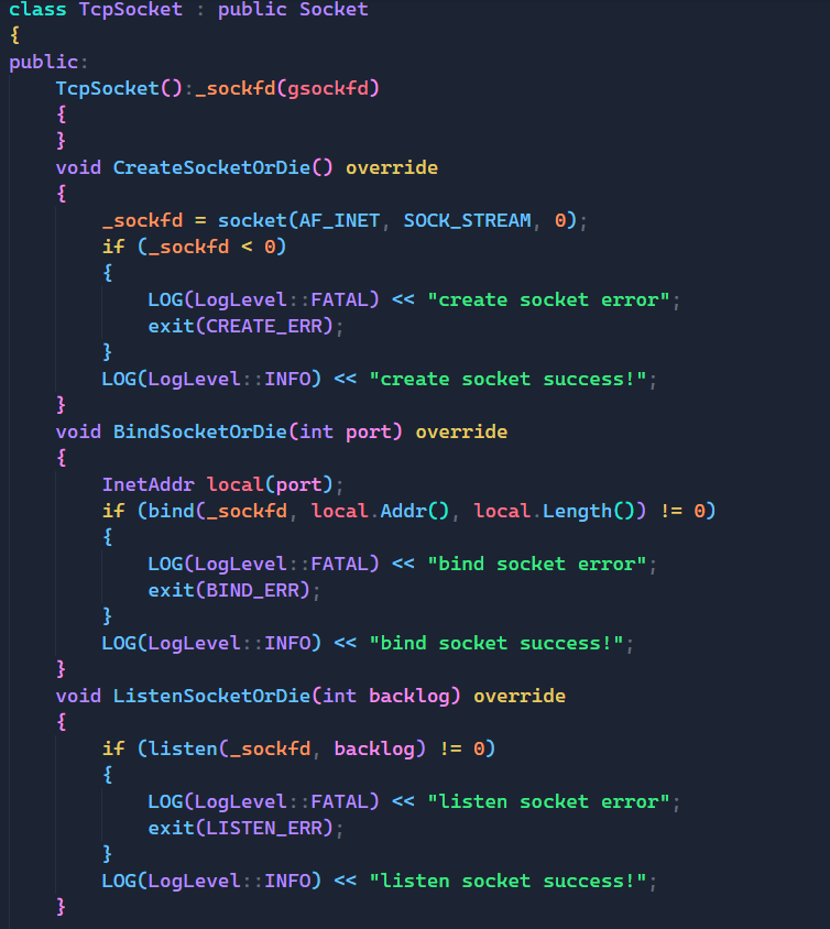 而我们上面在实现时我们将返回值设置为我们自定义的Socket类,这样做的原因可以让我们未来创建出来的sockfd都能够使用我们所设计的Socket类,不然就只有listensockfd,即监听套接字能用,那我们就没有单独设计Socket类的意义了。