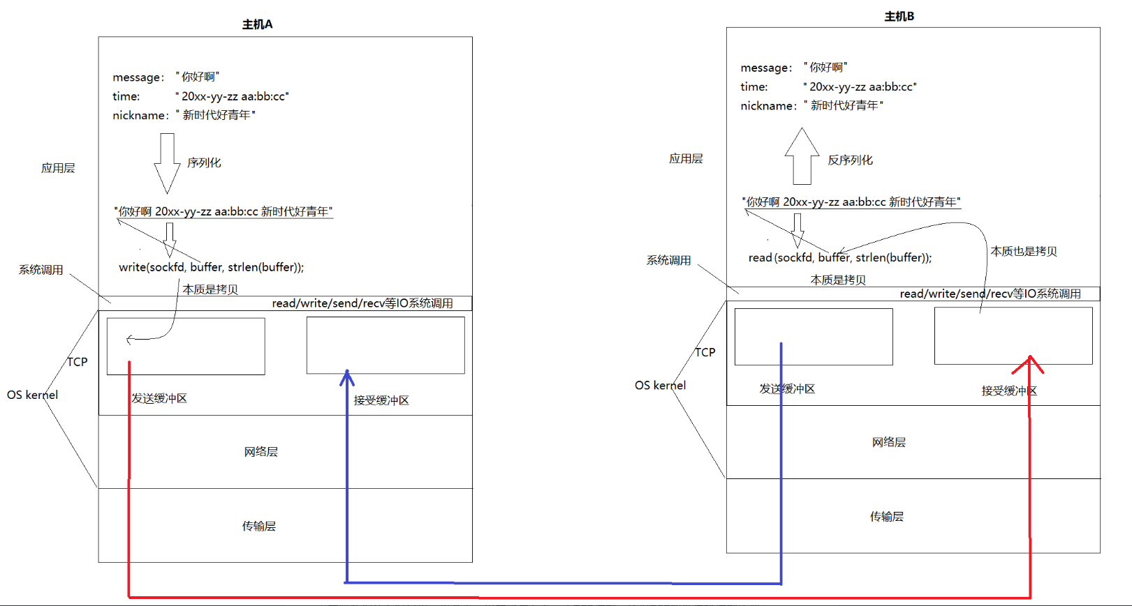 答案就是拷贝,这里我们就要输出第三个结论了:主机间通信的本质就是把发送方发送缓冲区内部的数据,拷贝到接收方的接收缓冲区中,一样是拷贝。