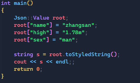 我们首先要定义一个Json库中的Value对象,这是一个万能对象,然后用法就是利用[]在里面填入你要用到的属性,=号后面就是该属性所对应的数据。