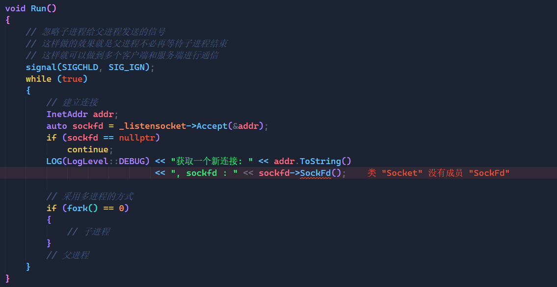 首先我们可以将Run函数实现到这个地步,这里我们采用多进程的方式来让服务端可以同时与多个客户端进行通信,来处理客户端的请求。