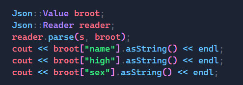而我们要打印的时候要用到Value对象的相关方法,如果里面是string类型的参数,就用asString,int类型就用asInt,其余皆是如此,但是char类型是没有的,我们可以用asInt代替。