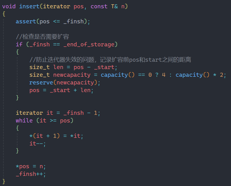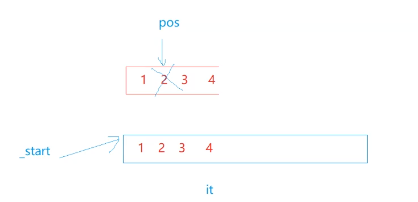 用图来解释就是我们扩容后,_start已经来到了新的空间,而pos依旧指向旧空间,那么在通过it和pos位置遍历数组是不是就会出问题?