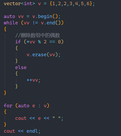 将erase函数返回的位置赋值给vv即可,其实vv本身的位置没有改变,只不过将它原本的值重新赋值给自己而已,使其重新变为有效的迭代器,所以我们上面写的erase函数就不太合适,应该写成如下这样: