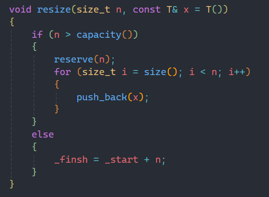 vector中resize的实现比较string就会更容易些,就分为两种情况,大于capacity和小于等于capacity,大于capacity是扩容+插入数据即可,小于等于时,更新_finsh的位置即可。