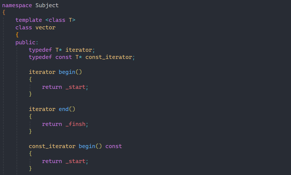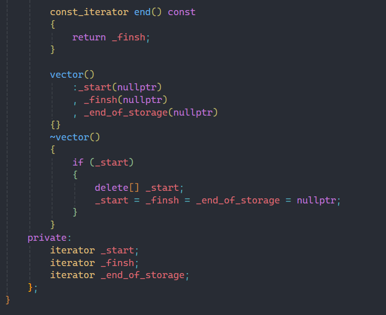 另外成员变量也能也有人不理解,这里这样定义成员变量的名字和成员变量的类型是因为vector底层源代码是这样定义的,源代码大家有机会可以看看,我们既然实现vector,就尽量跟着底层走。