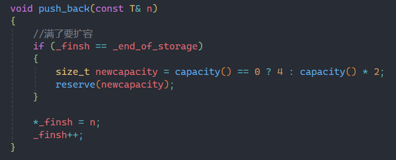 逻辑和之前实现string中的push_back一样,在尾插前检查此时数组是否满了,满了就扩容,最后在_finsh处加上目标值,并令_finsh++即可。