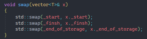 可能有人会疑惑为什么还要交换_finsh和_end_of_storage,如果不交换这两者的话,那么交换后的_start中的_finsh和_end_of_storage是不对应的,这么做就会使两者的意义就没有了,所以两者也要交换。