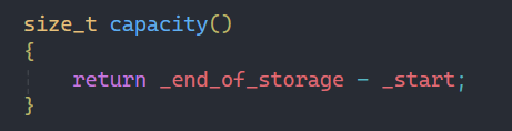 这里直接用_end_of_storage - _start就可以直接得到此时数组容量的大小,指针相减得到就是两个之间的大小。