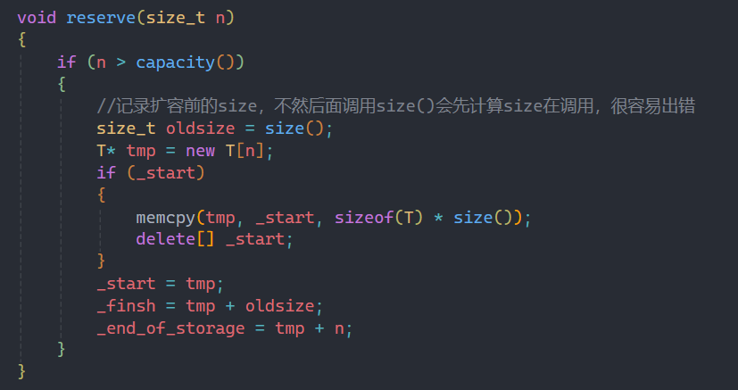在实现reserve中,如果此时_start为空,就可以直接让_start接收tmp的位置。