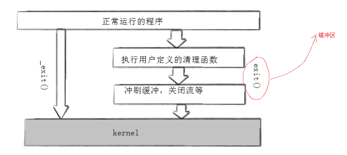 我们分别在初识struct file中和在进程终结的章节中提到了缓冲区的概念,我们从上面的两幅图可以看到,在struct file中的缓冲区前面有内核二字,而下面exit中我只写了缓冲区,说明这二者是有区别的,那么区别是什么呢?