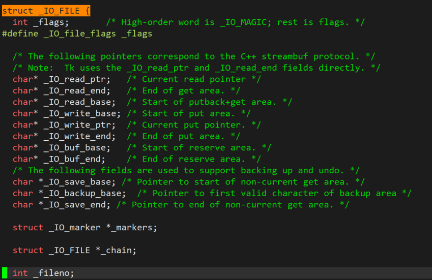上面就是C语言中实现的FILE结构体,在实现时叫做_IO_FILE,但是上面它会对其进行重命名为FILE,在这个结构体中我们可以看到各种char* 的指针,后面都有各自的介绍,这里就不多说了。
