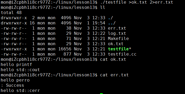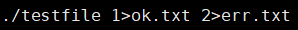 这次我们将1号标识符和2号标识符都进行重定向,正确的信息输入到ok.txt文件中,错误的信息输入到err.txt文件中,打印后就可以看到相应的内容。
