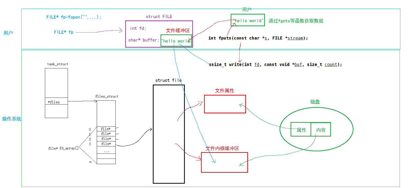 我们现在是用户,我们通过fgets,scanf等函数获取了" hello world "字符串数据,将其保存在一个字符数组中,而我们下来想通过printf,fprintf等函数将其打印到出来。