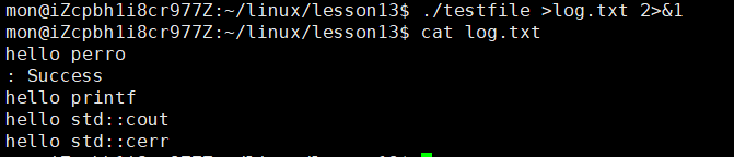 而通过上面的方式,在每个模块中如果出现问题,就用perror或者cerr打印出错误信息,而在最后执行的时候只需要进行上面的操作,我们就能把错误信息全部输入到一个文件中,这样一旦程序出问题,我们直接查看相应的错误信息文件就知道哪里出问题了,出的什么问题。