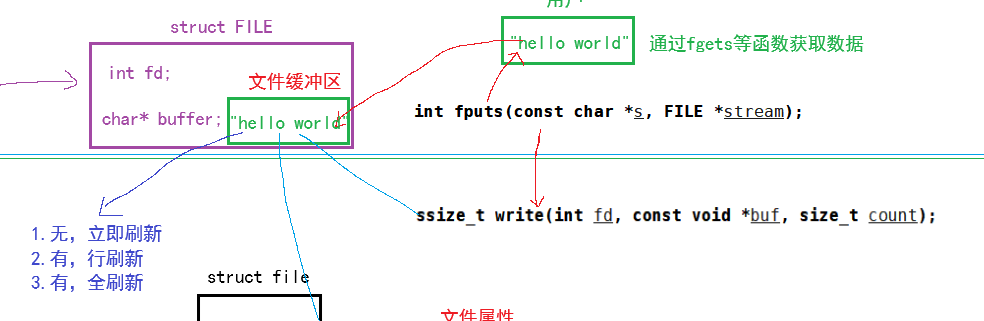 要解决这个问题,我们先设想一种情况:如果没有语言级别的缓冲区,那么我们是不是就没有了所谓的刷新策略,进而导致的结果就是只要有数据需要刷新,就会去调用write函数来执行。